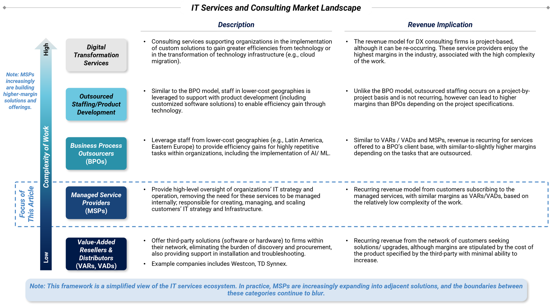 Managed Service Providers (MSPs) sit in the middle of the IT services landscape, overseeing clients’ IT strategy and infrastructure while increasingly moving beyond lower-complexity support into higher-margin, value-added solutions (e.g., Compliance Advisory, Managed Security).