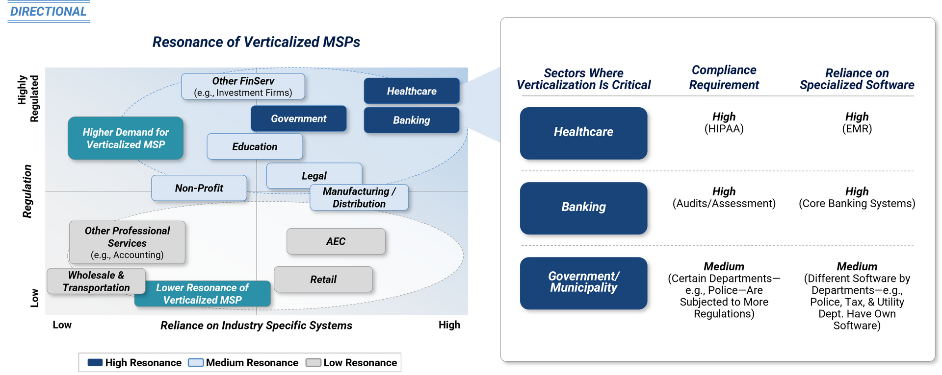 Description: Some MSPs choose to focus on a few verticals (e.g., Integris focuses on Financial Services, Legal, etc.; Medicus and MTS focusing on Healthcare). In highly regulated verticals and / or sectors rely on specialized line-of-business software, verticalized approach resonates strongly